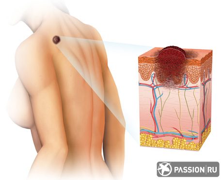 Что такое меланома? Это — опухоль, которая развивается из клеток, участвующих в окраске кожи. Эти клетки, меланоциты, под действием ультрафиолета вырабатывают окрашивающее вещество — меланин. Они также находятся в большом количестве в невусах и родинках. Перерождение меланоцитов происходит в результате воздействия многих факторов: ультрафиолетовой радиации, механической травмы, термических или химических ожогов и т.д. Меланома более опасна, чем другие виды рака кожи, т.к. быстро дает метастазы и захватывает другие органы через кровеносные сосуды и лимфатические узлы.