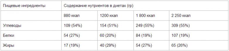 Предпочтение лучше отдавать сбалансированным по отдельным ингредиентам диетам. Ниже приводится таблица, в которой указано содержание основных компонентов пищи в низкокалорийных диетах.