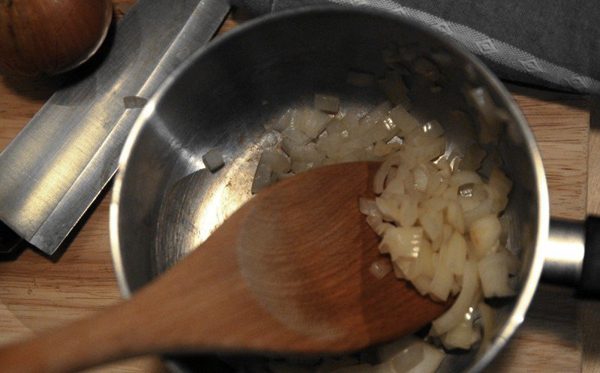 Луковицу и нарежте ее мелкими кубиками. Затем пожарьте их без масла в кастрюле или сковороде. Так выделятся эфирные масла, а едкий запах исчезнет.