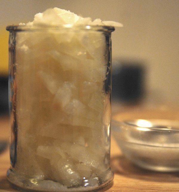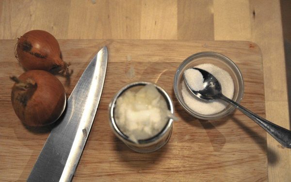 Затем пересыпте их в большой стакан или миску. Добавьте туда 1-3 столовых ложки сахара, в зависимости от размера луковицы. Вместо сахара можно сделать сок с медом.