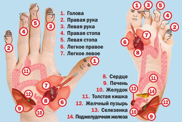 Согласно стандартной системе соответствия все тело проецируется на кисть и на стопу. При этом большие пальцы соответствуют голове, 3‑и и 4‑е пальцы кистей и стоп – ногам, 2‑е и 5‑е – рукам, на ладонь и подошву проецируется туловище.
