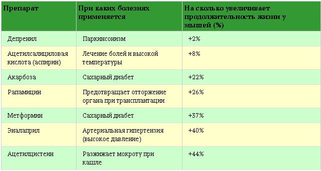 Мы проанализировали достаточно большое количество научной литературы и подготовили список некоторых известных лекарственных препаратов, способных увеличивать продолжительность жизни животных в эксперименте (см. таблицу)».
