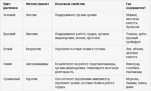 Фитонутриенты окрашивают растения в тот или иной цвет: например, ликопин присутствует в красных овощах и фруктах, каротин — в желтых и оранжевых, вещества антоцианидины придают плодам темно-синюю окраску.