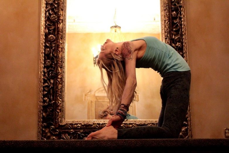 Станьте на колени. Немного разведите их. Ступни должны «смотреть» при этом вверх. Затем медленно прогнитесь назад. Правой рукой дотянитесь до правой ноги. Зафиксируйте руку на стопе и выпрямите ее в локте. Затем проделайте то же самое левой рукой, не отпуская правую. Голову отведите назад. Задержитесь в этой позе примерно на 20 секунд.