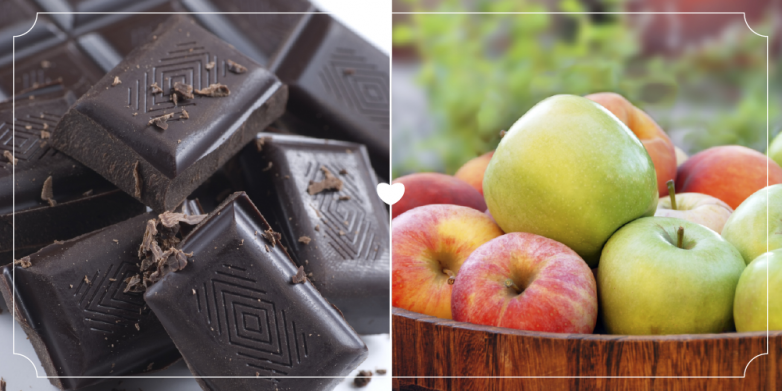 Соединение чёрного шоколада и яблок имеет мощный потенциал, который улучшит состояние вашей сердечно-сосудистой системы. В кожуре красного яблока содержится флавоноид кверцетин, который имеет противовоспалительные свойства, а тёмный шоколад, благодаря содержащемуся в нём какао, богат катехинами, антиоксидантами, которые помогают предотвратить артериосклероз. В паре они хорошо справляются с разрушением сгустков крови.
