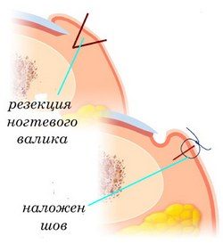 При более запущенных стадиях заболевания рекомендуется хирургическое вмешательство. Во время операции удаляют больной ноготь или же часть ногтевого валика. Обычно операция решает проблему вросшего ногтя, но может случиться и осложнение: повреждается ростковая зона ногтя. Тогда новый вырастающий ноготь будет иметь неправильную форму.