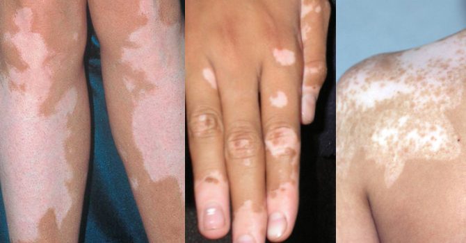 2. При витилиго пятна не ярко-красные, а розоватые или даже белые. Их можно заметить на любой части тела (руках, ногах, животе или спине).