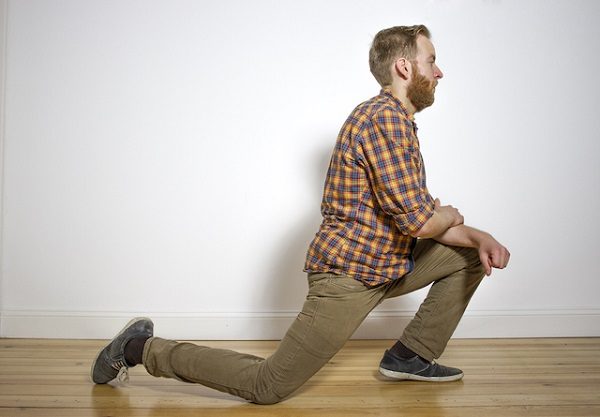 2. Сделайте выпад вперед, опираясь на колено всем весом. Задержитесь в напряженном положении на 20 секунд, почувствуйте, как выравнивается спина. Повторите для другой ноги. Не волнуйтесь, если услышите хруст, — спина приходит в норму после неестественной позы, позвонки становятся на свои места.