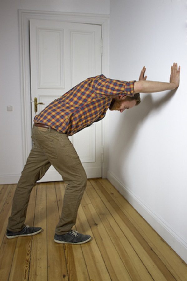 7. Подойдите к стене, хорошо обопритесь об нее руками. Медленно отходите, держа туловище параллельно полу и выпрямляя спину. Задержитесь в ровном положении на 20 секунд.