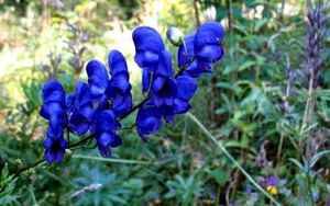 Аконит джунгарский — синий борец (местные названия: волкобой, прострел, прикрит, голубой лютик)тоже широко распространен. Чаще он растет на скалах. Яд аконита относится к наиболее токсичным алкалоидам, содержится во всех частях растения, особенно в корнеклубнях. Отравление бывает и в тех случаях, когда по ошибке выпивают спиртовую настойку аконита, применяемую в народной медицине в качестве растирки при радикулитах, невралгиях. Отравление аконитом дает о себе знать уже через несколько минут: появляется ощущение покалывания во рту, глотке, жжение, слюнотечение, боль в животе, рвота, чувством покалывания и онемения в различных участках тела. Кроме того, может возникнуть потеря слуха, нарушается зрение. В тяжелых случаях отмечаются судороги, потеря сознания, паралич мышц, остановка дыхания.