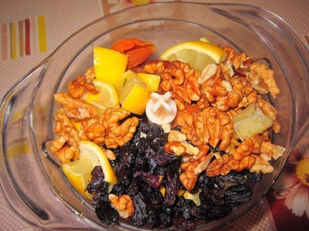 500 г изюма;500 г кураги;500 г инжира;500 г чернослива без косточек;500 г мëда;2 стакана грецких орехов;1 лимон с кожурой.