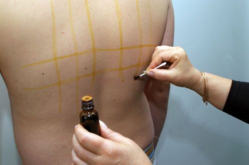 Йодную сетку на кожу наносят при помощи ватных косметических палочек – тех же самых, что обычно применяются для чистки серы в ушах. Такую палочку нужно обмакнуть в 5%-ный раствор йода и нарисовать на теле решетку из вертикальных и горизонтальных полос. Величина «ячеек» идеальной йодной сетки обычно составляет около 1 квадратного сантиметра.