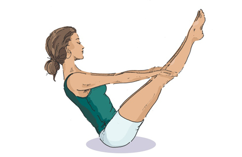 d) Поднимите ноги выше, чтобы колени коснулись рук, и ваше тело образовало букву V (как показано на картинке).
