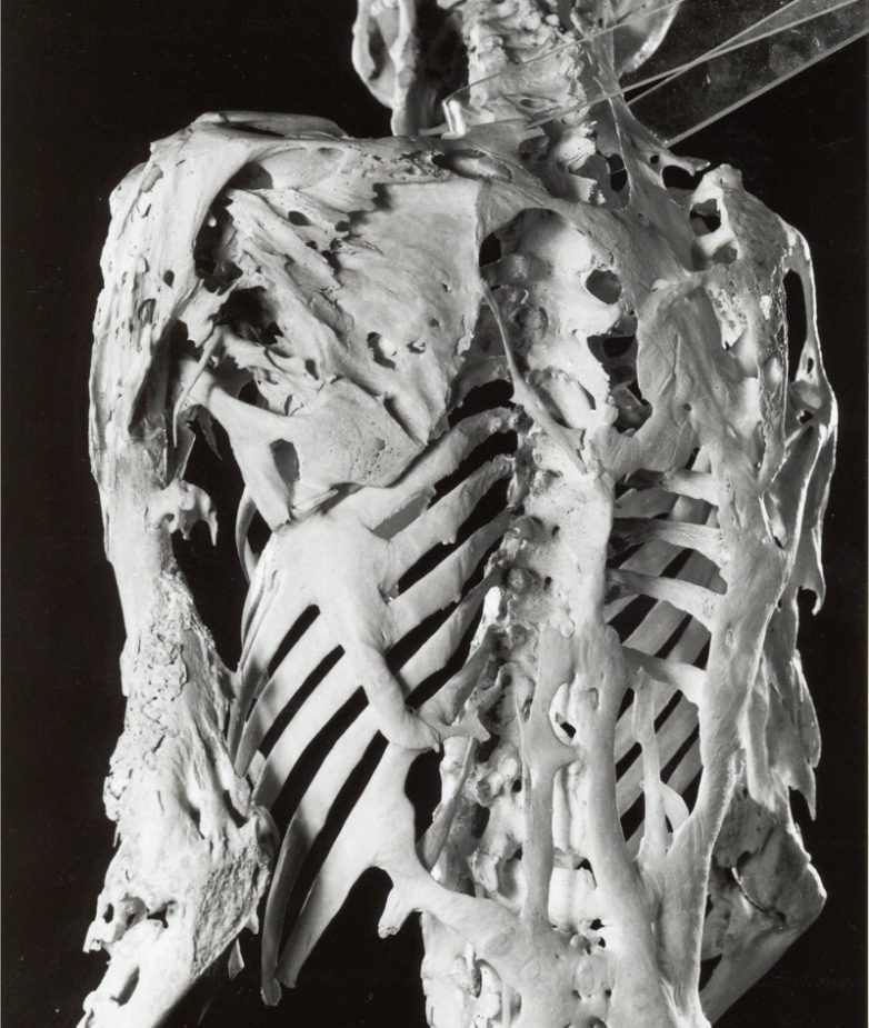 При этом редком и тяжелом заболевании мышцы, сухожилия и связки человека постепенно превращаются в кости. По мере того, как затвердевают мягкие ткани, подвижность начинает ухудшаться. Процесс затвердевания, который начинается с детства, стартует с шеи и медленно продвигается вниз. По мере прогрессирования болезни, мягкие ткани вокруг ребер также превращаются в кости, за счет чего развиваются проблемы с дыханием. Кость давит на легкие и сделать глубокий вдох становится практически невозможным. Человек фактически превращается в живую статую. Больные ФОП обычно не живут дольше 40 лет.