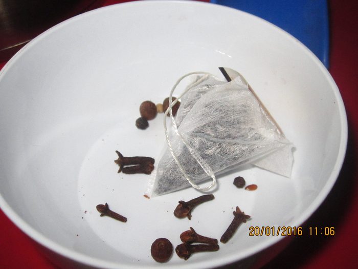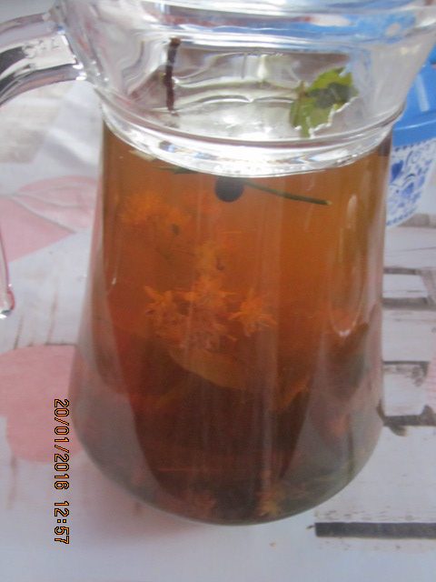 Основные компоненты: Вода -1л, перец черный горошек -4шт, перец душистый горошек -4шт, гвоздика -5шт, липовый цвет – 3стл, чай зеленый -1пакетик, мед –по вкусу.