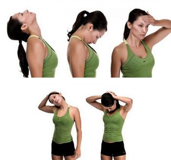 Упражнение 1. Наклоните голову вперёд, одновременно надавливая на лоб пальцами рук. Последовательно надавите пальцами на затылок и виски — левый, правый. Голова противодействует давлению рук, а руки -давлению головы. Достаточно 10 секунд на каждое движение.