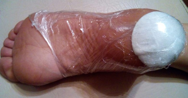 Заверните пятку полиэтиленовой пленкой и оставьте на ночь.