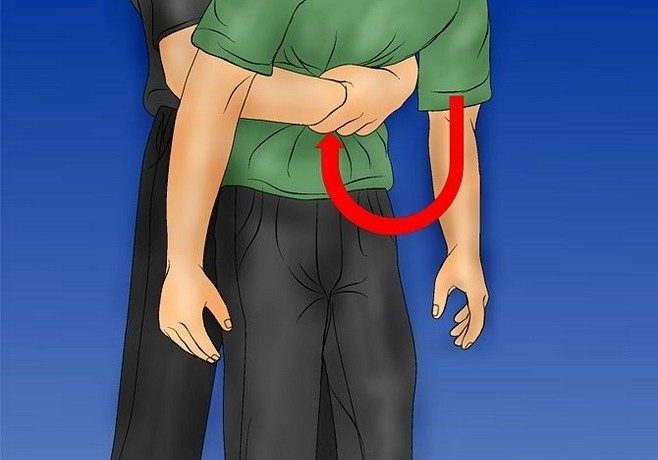Суть данного приема заключается в том, что мы подходим сзади пострадавшего, обхватываем его руками так, чтоб наши руки находились под диафрагмой и резким сильным движением надавливаем на живот. Это способствует резкому сокращению диафрагмы и сильному выдоху, который может практически «выдуть» кусочек пищи из гортани.