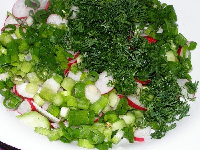 Нарезаем зелень, листья салата и огурцы с редиской. Солим по вкусу, заправляем майонезом. Можете съесть салат весь сразу.