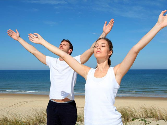 • Встаньте прямо, ноги вместе, руки поднимите вверх, потянитесь вверх, поднявшись на носки, глубоко вдыхая через нос. Опустите руки вниз, встаньте на всю ступню и сделайте выдох через рот. Выдыхая, произносите «у-х-х-х-х». Повторить 4-5 раз.