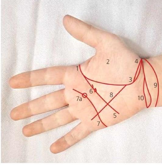 Раздвоенная линия Жизни (4) несет двойной смысл — это либо безобидный знак иммиграции, либо признак заболевания эндокринной системы.