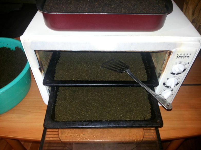 Я сушу его в обычной духовке партией по два противня при t:150-180 C° в течении часа. Процесс до ужаса долгий и займёт у Вас не менее всего вечера (если у Вас серьёзная партия). При этом необходимо каждые три-пять минут помешивать листы с чаем. Короче, халява не прокатит, если только не отловите кого-нибудь проходящего мимо кухни и не уговорите помогать. Во время сушки чай становится по виду не отличим от обычного.