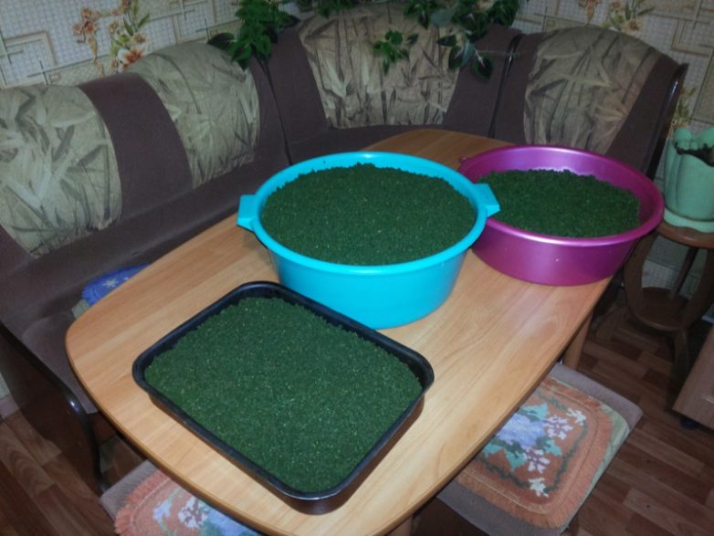 Ждём, ориентировочно, пару дней и видим, что края у листьев стали немного заворачиваться. Это значит, что кипрей завялился и готов к дальнейшей обработке.Собираем его в тару и тащим на кухню.