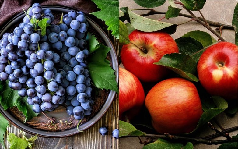 Яблоки — это находка для тех, кто придерживается правильного питания. Они хорошо утоляют голод, в них много ценных микроэлементов, клетчатки и антиоксидантов. У тех, кто ест много яблок, гораздо позже появляется целлюлит.В отличие от яблок, виноград настоящий вредитель. В нём много сахара и его кожица очень тяжело переваривается. Кроме того, кислоты винограда разрушают зубную эмаль.