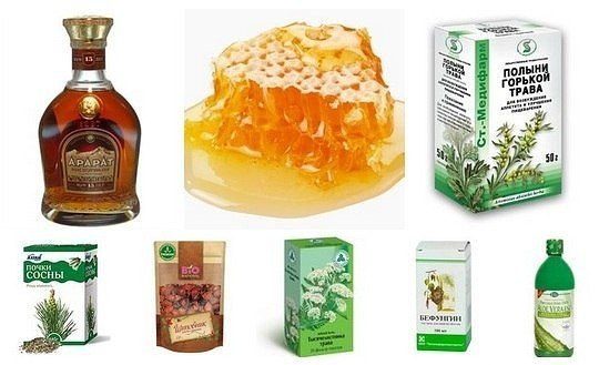 100 мл. аптечного экстракта чаги (бефунгин), по 75 г. сухого измельченного тысячелистника и плодов шиповника, 60 г. сосновых почек, 2,5 г. сухой полыни, 250 г. натурального меда, 125 мл. коньяка, 100 мл. сока алоэ.