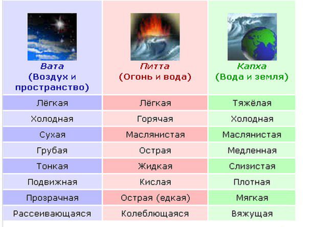 Эти три элемента — вата, питта, капха — ответственны за все биологические, психологические и физиопатологические (болезнетворные) функции тела, ума и сознания. Они действуют и как основная составляющая часть тела, и как защитный барьер, создавая нормальный психологический фон. Когда эти элементы разбалансированы, то возникают болезненные процессы.