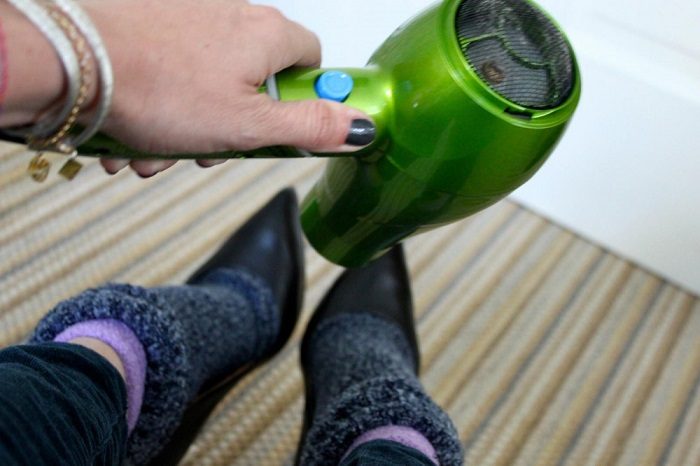 Чтобы всё получилось, надень плотные теплые носки, а затем обувь, которую нужно растянуть, и возьми фен. Прогревай обувь, периодически смачивая ее водой либо уксусом.