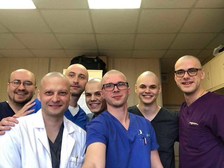 «На следующий день я пришел утром на работу, зашел в ординаторскую, смотрю — а они все в шапочках. Я не понял, почему в шапочках. Вдруг они сняли шапки…», — смеется Андрей. Всё отделение онкохирургии побрилось налысо, чтобы поддержать и развеселить своего наставника.