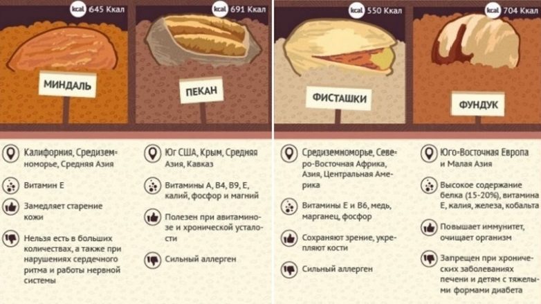 Однако этим орехом не стоит увлекаться тем, кто хочет сохранить свою фигуру, — в нём содержится до 70 % жиров. Поэтому стоит съедать не больше 30 орешков в день.