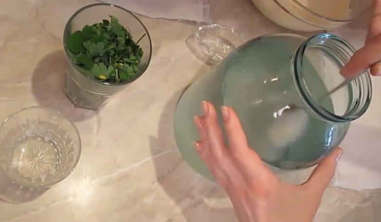 Пересыпь нарезанный чистотел на марлю. Сверни ее и помести в банку. Чтобы чистотел опустился на дно, можешь положить внутрь марли небольшой камешек.