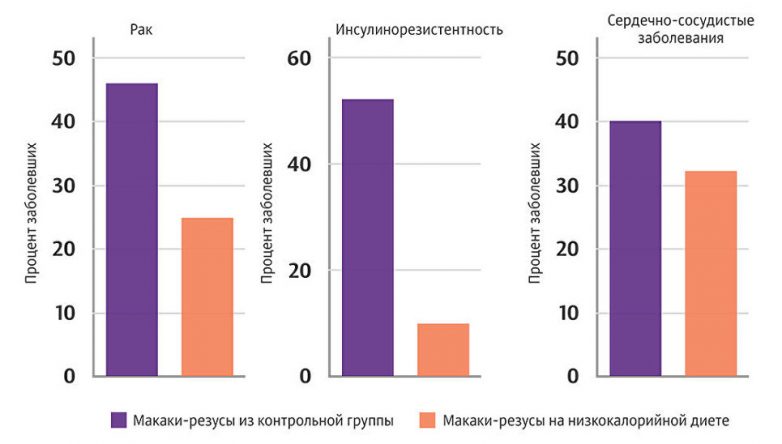 В первом случае обезьяны, сидящие на низкокалорийной диете, жили значительно дольше животных из контрольной группы и реже умирали от диабета, рака и сердечно-сосудистых заболеваний. Их сородичам из Национального института старения повезло меньше — хотя они тоже были здоровее приматов из контрольной группы, жили обезьяны примерно столько же.