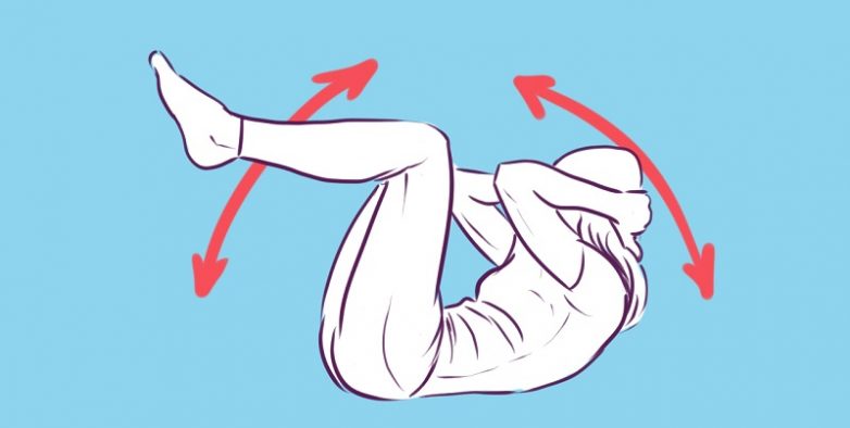 Из положения лежа на спине положи руки на затылок, но не складывай их в замок. Подтяни правый локоть к левому колену, плавно опусти левую ногу вниз. Подтяни левый локоть к правому колену, плавно опусти правую ногу вниз. Ни в коем случае не тяни затылок руками, руки должны лежать на затылке свободно! Выполни это упражнение 4–6 раз в каждую сторону.