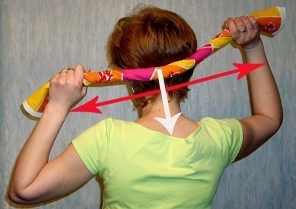 Возьмите в обе руки скрученное жгутом полотенце, слегка натяните и прижмите к затылочным буграм головы.