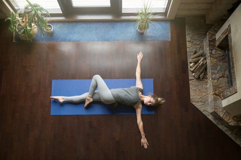 Ляг на спину, ноги прямые, руки разведены в стороны. Левую ногу согни в колене и перекинь через колено правой ноги. Тянись коленом в левую сторону, пытаясь коснуться пола. Можешь помогать себе правой рукой. Задержись в таком положении на 10 вдохов, затем вернись в исходную позицию и повтори то же самое для противоположной ноги.
