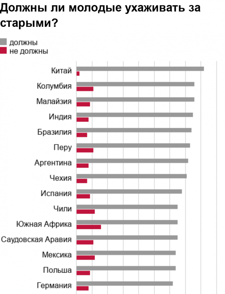 Респонденты в небогатых странах Азии и Латинской Америки в подавляющем большинстве считают, что молодежь должна ухаживать за престарелыми родственниками.