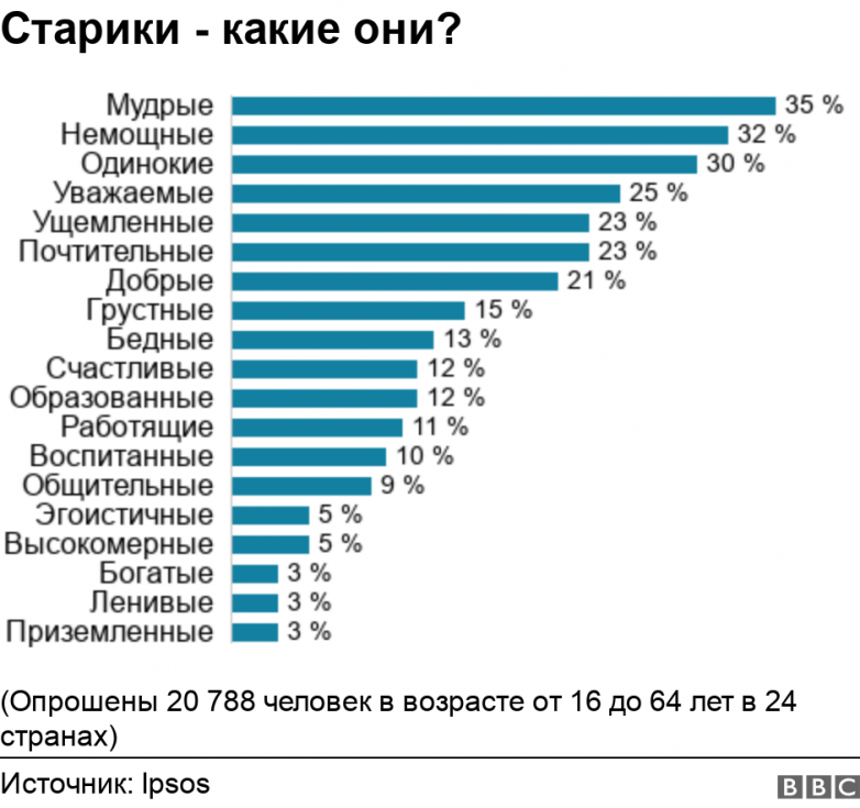 И тут примерно треть опрошенных сошлись на трех определениях: мудрость, немощность и одиночество. Только четверть полагает, что старикам везде у нас почёт.