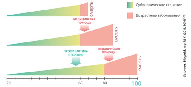 Третья модель подразумевает активные действия, позволяющие отодвинуть старение и начало развития возрастных болезней с 60−65 до 80 лет, а когда они возникнут, благодаря активной терапии жизнь можно продлить до 100 лет (нижняя схема).