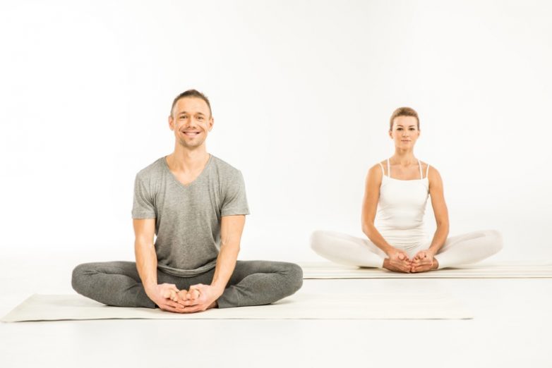 Согни ноги в коленях и разведи колени в стороны как можно ниже к полу.Стопы сведены вместе: внутренние части стоп отведены в стороны, а внешние соприкасаются друг с другом. Можно слегка надавливать руками на колени. В таком положении достаточно посидеть 1–2 минуты.