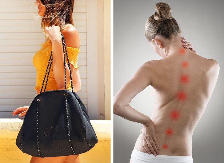 Женская сумочка — это сокровищница, в которой можно найти почти все: от косметички до ноутбука. Это очень удобно, но небезопасно для здоровья. Из-за того что мы постоянно носим сумку на одном плече, увеличивается нагрузка на плечевой сустав и межпозвоночные диски, что приводит к сколиозу и остеохондрозу. Из-за неправильного распределения веса перенапрягаются и защемляются мышцы, перекрываются кровеносные сосуды, которые питают мозг, и нервные окончания.