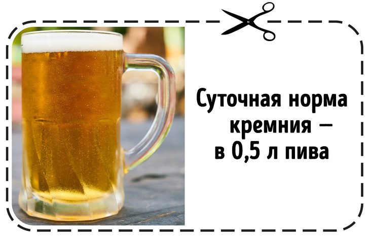Пиво — один из главных источников кремния. В различных сортах этого напитка может содержаться от 6,4 до 56,5 мг на 1 л при ежедневной норме в 20–30 мг. Именно кремний отвечает за доставку кальция в кости и сохранение плотности костной ткани. Кремний помогает снизить риск развития атеросклероза — болезни, поражающей сосуды и становящейся причиной инфаркта.