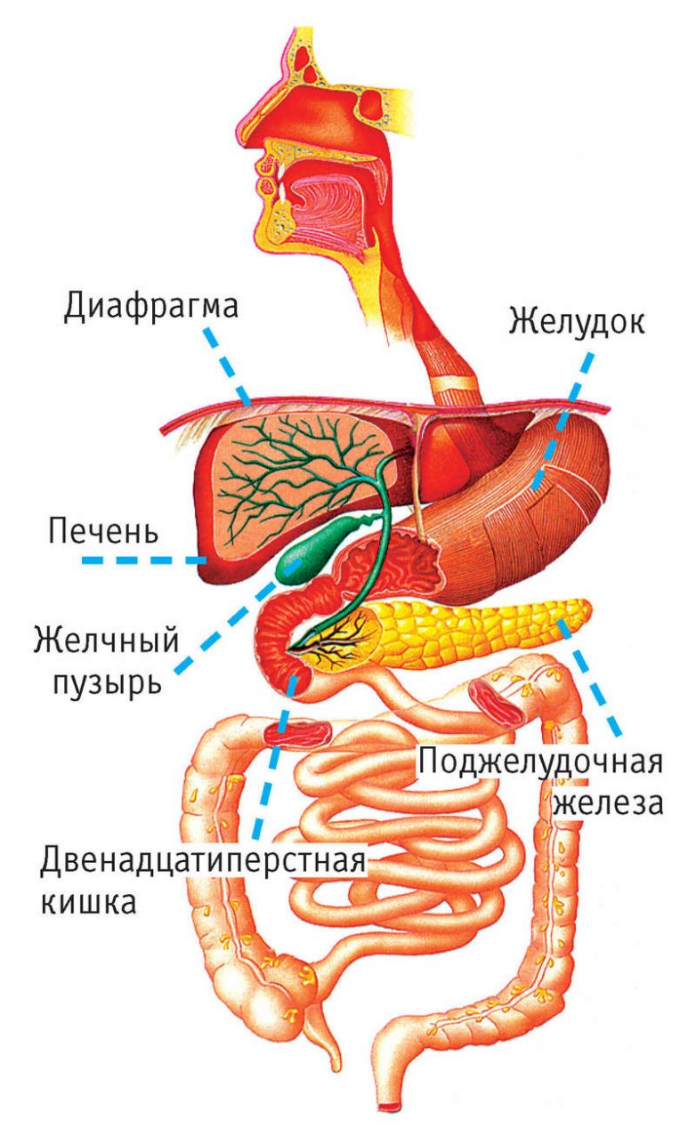 Большая часть печени находится в области правого подреберья под диафрагмой в брюшной полости. Печень и желчный пузырь выполняют огромное количество функций.Основные функции печени: