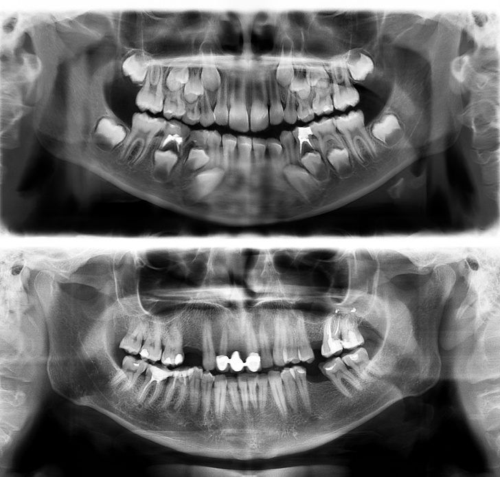 13. Так выглядят зубы человека в 7 (вверху) и в 30 лет