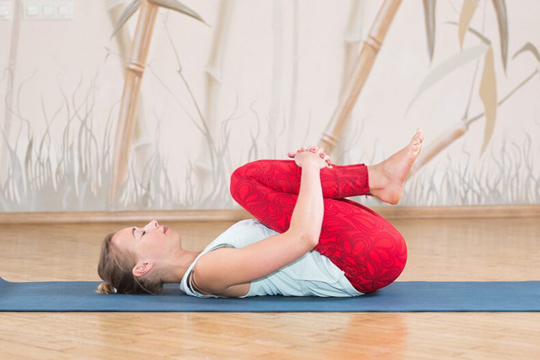 Лягте на спину, выпрямите ноги. Вдохните и на выдохе согните правую ногу в колене и подтяните ее к груди. Обхватите колено обеими руками и прижмите ногу к животу как можно плотнее. На 4 секунды задержите дыхание и зафиксируйте это положение. Выдохните, выпрямите ногу, расслабьтесь. Повторите с левой ноги. Выполните по 5 раз каждой ногой.