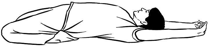 Оставаясь в позе сейдза, с помощью кистей и предплечий медленно лягте на спину. Ваши стопы остаются под бёдрами, ладони над головой, растягивайтесь вверх и в сторону от головы, как изображено на рисунке ниже.Затем поднимите правое плечо с пола и выполните скручивание влево.