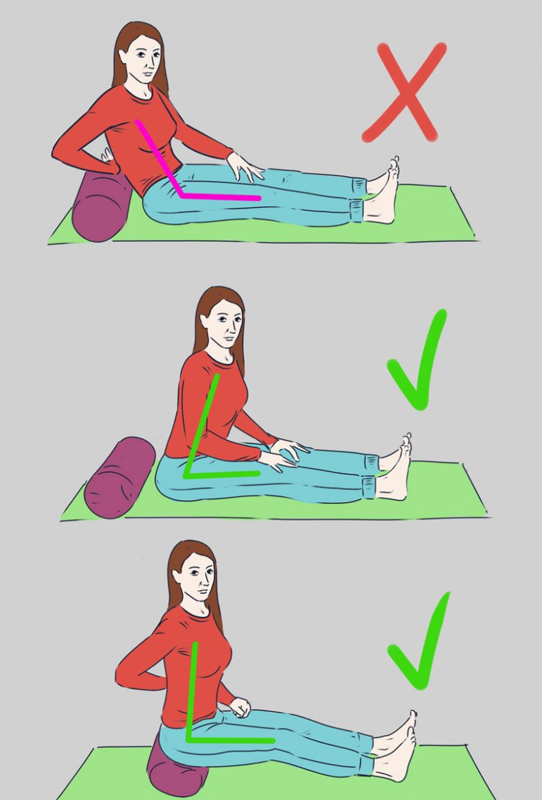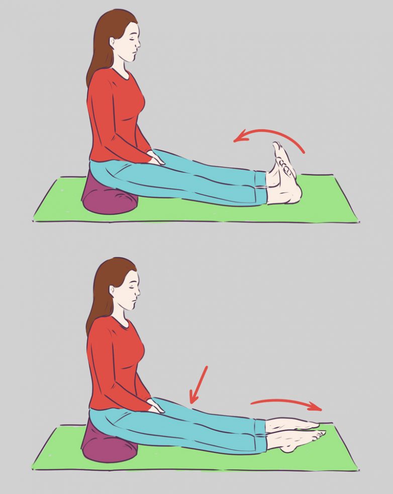 Сядь на коврик, вытянув ноги вперед. Если в этом положении поясница сильно округляется и корпус откланяется назад, то нужно сесть на возвышение. Начинай поочередно тянуть пальцы ног от себя, будто держишь карандаш, а затем тяни пальцы на себя, толкая при этом подушечку под большим пальцем от себя. Старайся держать ноги прямыми.