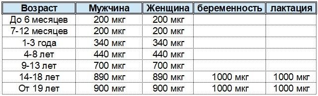 В таблице приведены текущие РДА для меди. Для младенцев от рождения и до 12 месяцев установлен уровень АП, который эквивалентен среднему потреблению меди у здоровых грудных детей.